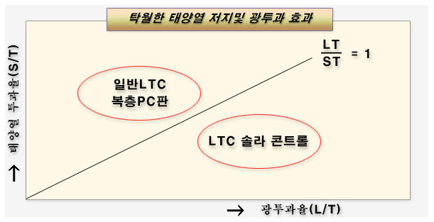 진정한 Solar Control 기술을 적용한 제품은 빛 투과율(L/T) ---> 열 투과율(S/T) 1을 만족해야 합니다.