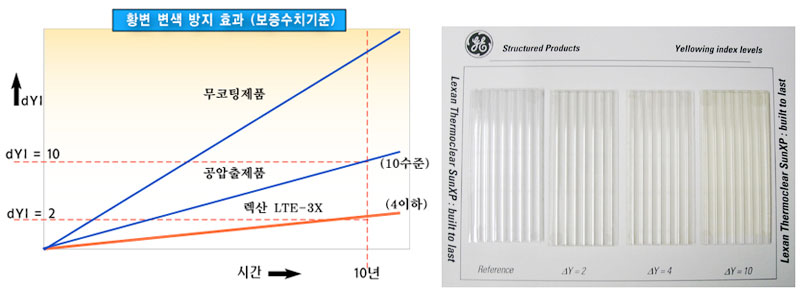 변색 지수(dYI) : 렉산 LTC : 4이하(10년) / 일반 공압 출 복층 반 : 10이하(10년)