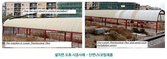 양면 자외선(UV) 코팅 - 렉산 LTC는 전 사양에 양면 UV 코팅 처리를 하여 설치상에 오류 문제를 근본적으로 해결하였습니다. - 일반적인 PC(폴리카보네이트) 복층 판연 한쪽 면만 UV 방지 처리가 되어 시공상 설치 오류로 인한 변색 문제가 종종 발생합니다. (아래 그림 참조)