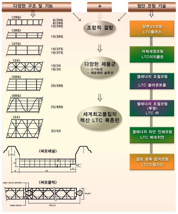 설계 자유도 우수 - LTC는 자재를 휘어서 설치할 경우(곡면 시공),내 풍압 강도가 더욱 강해집니다. · 다양한 제품군을 보유한 세계 최고 품질의 복층 제품입니다. - 다양한 단면 구조 : 구조강도용, 인테리어용, 창호 지붕재용 등. - 다양한 색상 : 기본 색상(투명, 백색, 브론즈, 블루, 그린 등) / 특수 컬러(메탈그레이 등) 및 주문 색상